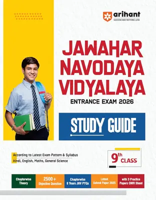 BOOK INTRODUCTION Prepare with confidence for the Jawahar Navodaya Vidyalaya class 9 entrance exam 2026, conducted by the Navodaya Vidyalaya Samiti. This comprehensive study guide book is designed to help students master theory, exam pattern, improve problem-solving skills, and boost their confidence through extensive practice. WHO WILL BENEFIT? Students appearing for the JNV Class 9 Entrance Exam 2026 Aspirants looking for detailed solved papers and practice sets BOOK KEY FEATURES According to the latest exam pattern & syllabus Chapterwise Theory with in-detailed explanations 2500+ Objective Questions Chapterwise for extensive practice Chapterwise 8 years JNV PYQs for paper pattern analysis Latest Solved Paper 2025 to understand the latest trend and question types 3 Practice Papers OMR Sheet to boost your confidence HOW WILL THIS BOOK BENEFITS YOU? Build concept clarity with structured Chapterwise theory Enhance speed & accuracy with 2500+ practice questions Familiarize yourself with real exam questions Experience exam-like practice TABLE OF CONTENTS Solved Papers (2025 & 2024), English, Hindi, General Science, Mathematics, Practice Sets (1-3
