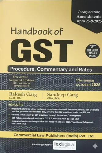 Important reference tables containing compliance chart with limitation periods, non-creditable suppiles, panalties and offences, etc., covering the vital provisions under the GST law Detalled commentary on GST provisions through Illustrations/tables/graphs GST Rates on goods and services in GST 2.0, effestive from 22 Sept. 2025 Separate Chapters on Comparative GST Rates on 22 Sept. 2025, Transitional Safeguards and Latest FAQS