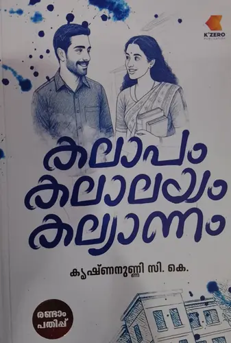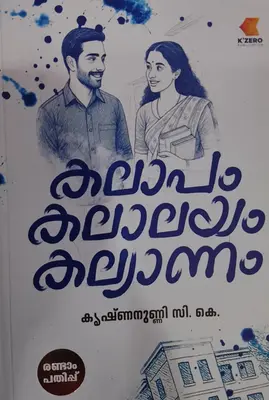 Kalapam Kalalayam Kalyanam Krishnanunni C.K K'Zero Publication ഒരു ടൈം ട്രാവെല്ലിങ് മെഷീൻ കിട്ടിയാൽ നിങ്ങൾ കുറച്ചുകാലം പുറകോട്ട് പോകാനായിരിക്കുമോ അതോ മുന്നോട്ട് പോകാനായിരിക്കുമോ ആഗ്രഹിക്കുക? എന്തുതന്നെയായാലും ഈ പുസ്തകവായനയിലൂടെ ഞാൻ നിങ്ങളെ ആയിരത്തി തൊള്ളായിരത്തി അറുപതുകളുടെ തുടക്കത്തിൽ ഇരവിപുരത്തുനടന്ന ഒരു കലാപത്തിലേക്കും പിന്നീട് മനോഹരമായ ഒരു കലാലയ കാലഘട്ടത്തിലേക്കും, തുടർന്നൊരു കല്യാണപ്പന്തലിലേക്കുമാണ് കൊണ്ടുപോകുന്നത്.
