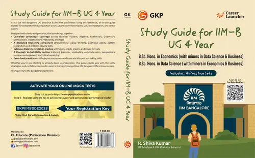 Study Guide for IIM-B UG 4 Year Crack the IIM Bangalore UG Entrance Exam with confidence using this definitive, all-in-one guide crafted for comprehensive preparation across Quantitative Techniques, Data Interpretation, and Verbal Ability. Designed with clarity and precision, this book brings together: Complete conceptual coverage across Number System, Algebra, Arithmetic, Geometry, Mensuration, Trigonometry, Probability, and more. A dedicated Reasoning component strengthening logical thinking, analytical ability, pattern recognition, and problem-solving skills Extensive Data Interpretation practice with tables, charts, graphs, and mixed formats A thorough Verbal Ability section featuring grammar, vocabulary, comprehension, parajumbles, sentence arrangement, and critical reasoning Exam-level practice sets to help you assess your readiness and sharpen test-taking skills Whether you're just starting or already deep in preparation, this guide equips you with the tools, strategies, and confidence needed to excel in the highly competitive IIM Bangalore IPM entrance exam. Your journey to IIM Bangalore begins here.